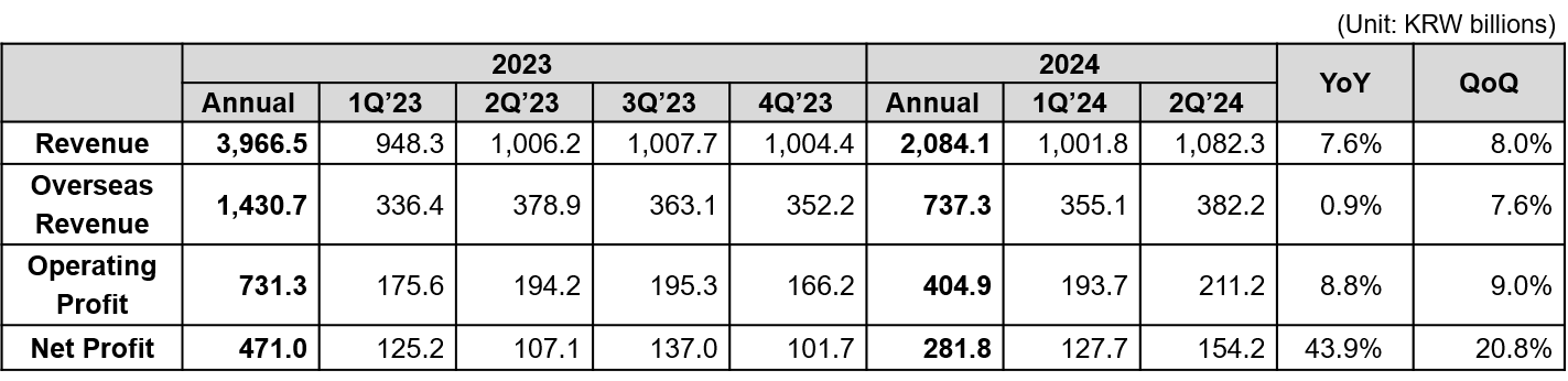 - Second quarter revenue: KRW 1,082.3 billion (+7.6% YoY)