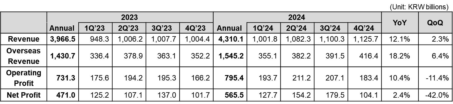 - Annual revenue: KRW 4,310.1 billion (+8.7% YoY)