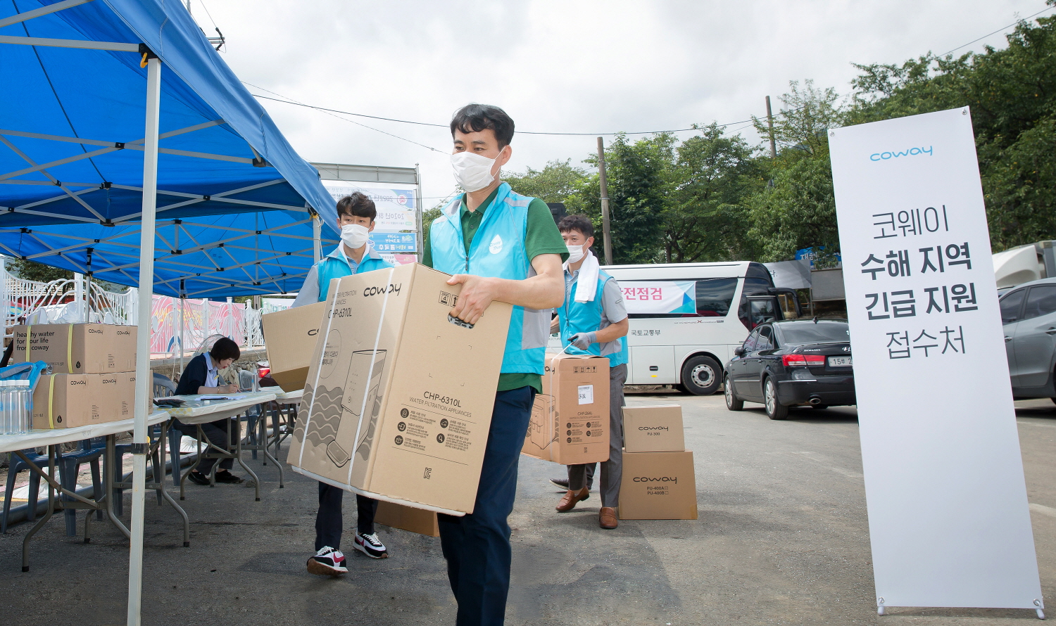 라이프케어기업 코웨이(대표 이해선, www.coway.co.kr) 직원들이 지난 13일 폭우로 침수 피해를 입은 경상남도 하동 지역을 찾아가 긴급 지원 서비스 거점을 마련하고 침수된 제품을 무상 점검 및 교환해 주는 등 수해 지역 주민 돕기에 나섰다. 또한 코웨이는 폭우 피해로 인해 마실 물이 부족한 이재민들을 위해 생수를 긴급 지원한다. 코웨이는 침수 피해가 심한 지역 위주로 무상 점검 및 교환 등의 긴급 지원을 지속해 나갈 예정이다.