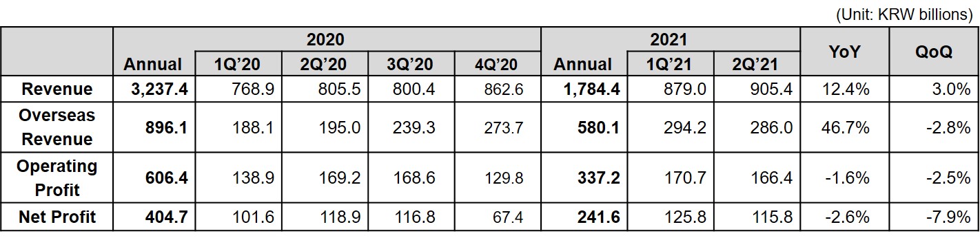 The company reported second-quarter revenue of KRW 905.4 billion, making it their most successful quarter in history. During this period, the operating profit and net profit were KRW 166.4 billion and KRW 115.8 billion, respectively.