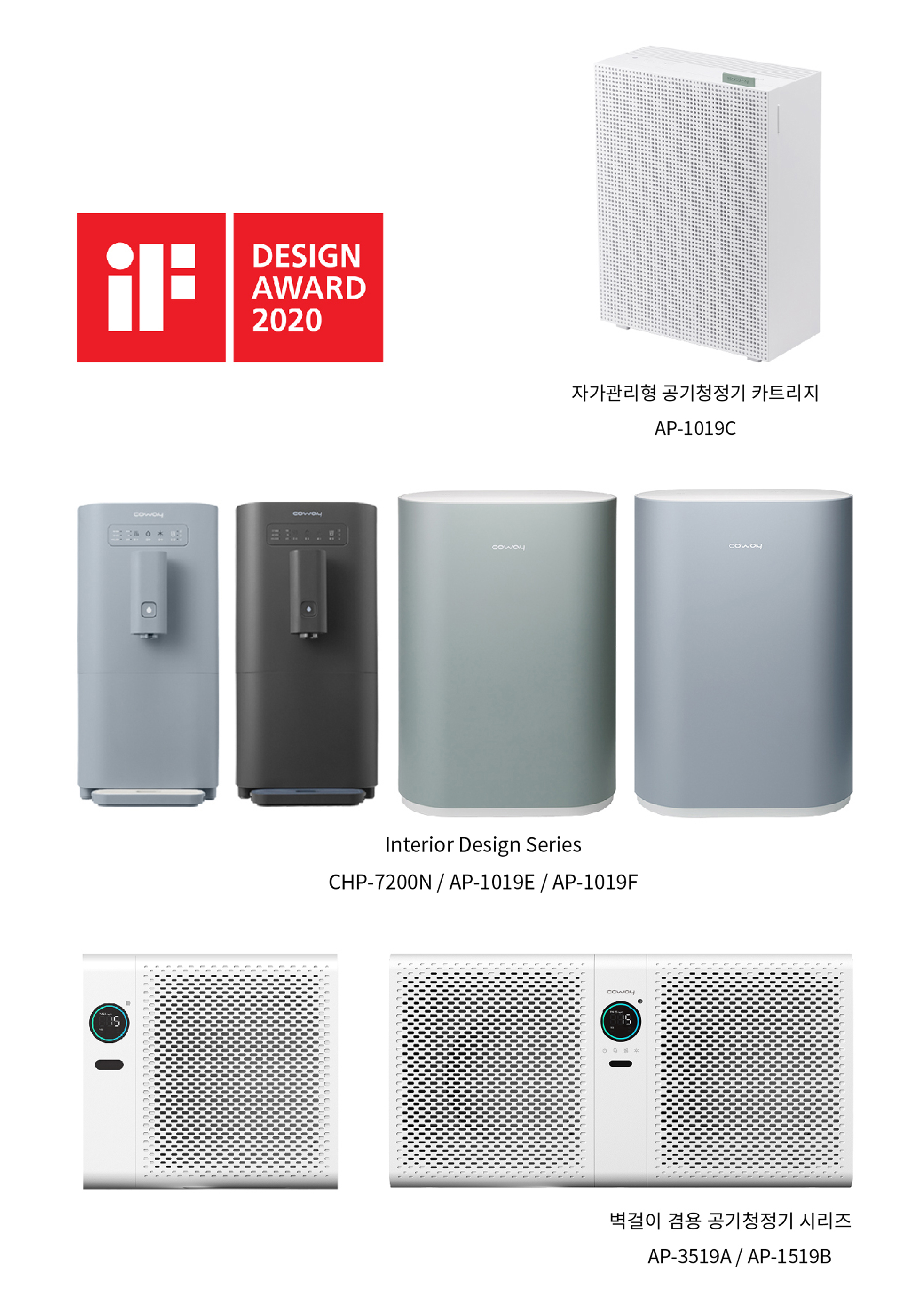 인테리어 디자인 시리즈(CHP-7200N, AP-1019)는 기존 제품의 ‘딱딱하고 차가운 가전’이라는 이미지를 벗어나 ‘집안 분위기를 바꾸는 감성 가전’이라는 이미지에 중점을 뒀다. 따뜻한 색상과 소재를 사용해 실내 인테리어와 자연스럽게 조화를 이룬다. 또한 정수기 CHP-7200N은 정사각형 디자인을 적용해 공간을 넓게 활용할 수 있으며 공기청정기 AP-1019는 깨끗한 공기를 만드는 본연의 기능에 집중해 직관적인 미니멀 디자인을 추구했다.