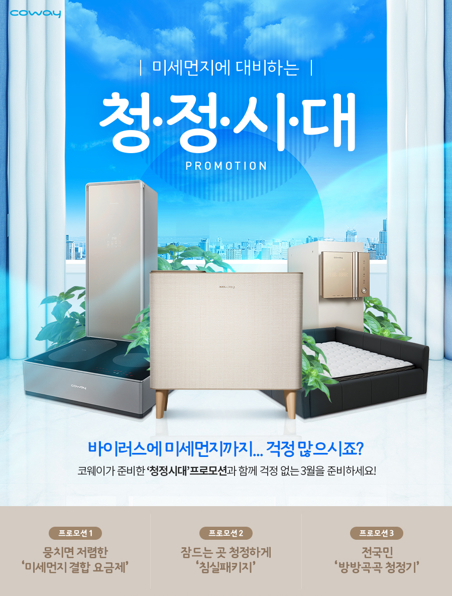 라이프케어기업 코웨이(대표 이해선)가 다가오는 봄철 이사 시즌을 맞이해 고객들이 미세먼지 및 황사를 사전에 대비할 수 있도록 3월 한 달 동안 ‘청정시대 프로모션’을 진행한다.