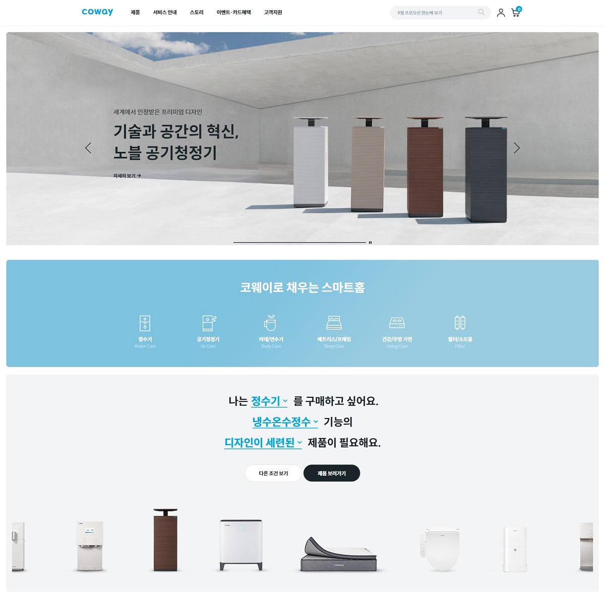 새롭게 오픈한 ‘코웨이닷컴’은 코웨이 제품을 쉽고, 간편하게 렌탈 및 구매할 수 있도록 커머스 기능을 강화한 온라인 자사몰로 고객의 라이프 스타일에 따른 제품 검색과 맞춤형 제품 추천 기능을 통해 소비자가 원하는 제품을 쉽고 빠르게 제안해 준다.