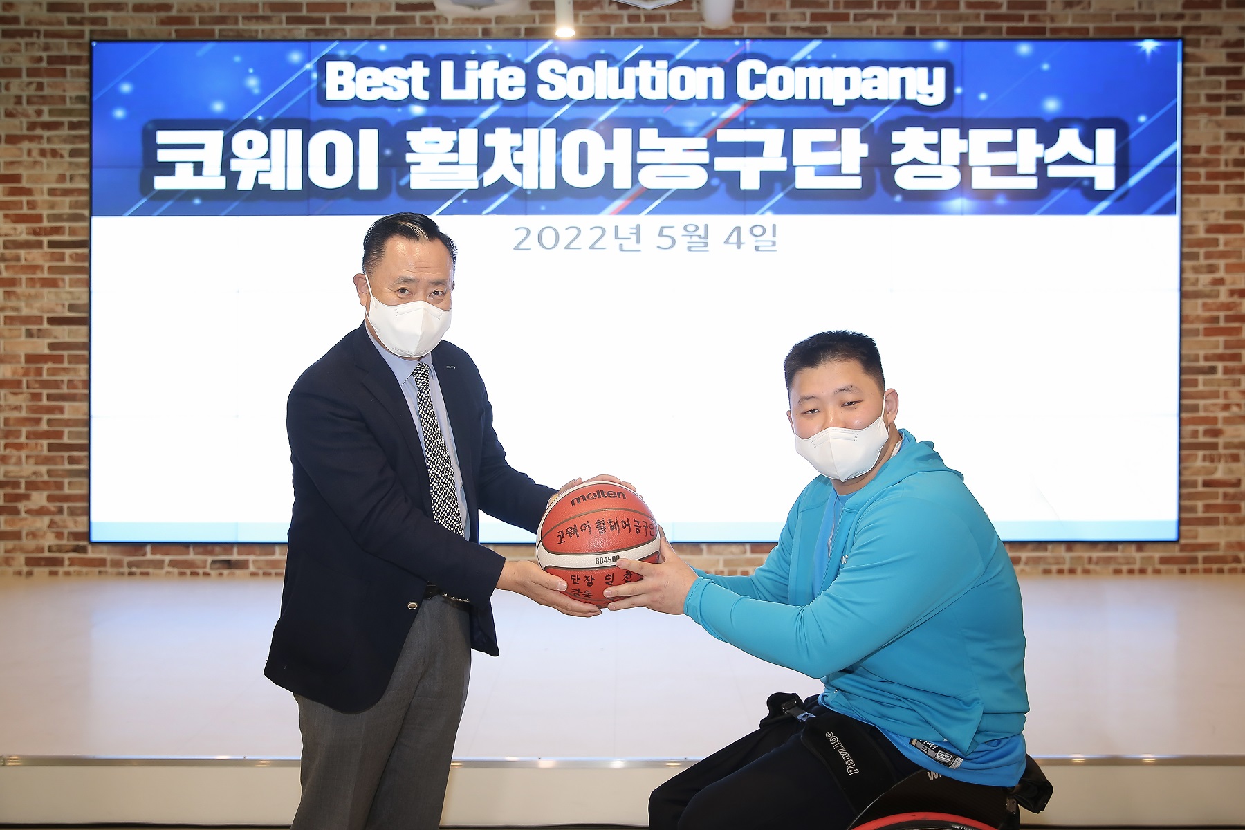 [사진자료 2] 4일 오후 코웨이 본사 G타워에서 진행된 코웨이 휠체어농구단 창단식에서 이해선 코웨이 부회장(왼쪽)에게 주장 양동길 선수(오른쪽)가 감사의 의미로 사인볼을 전달하고 있다.