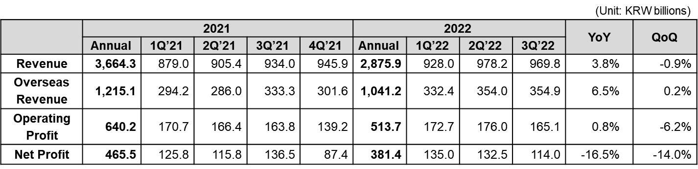 Cumulative revenue for 2022 now stands at KRW 2,875.9 billion (+5.8% YoY), with an operating profit of KRW 513.7 billion (+2.5% YoY).