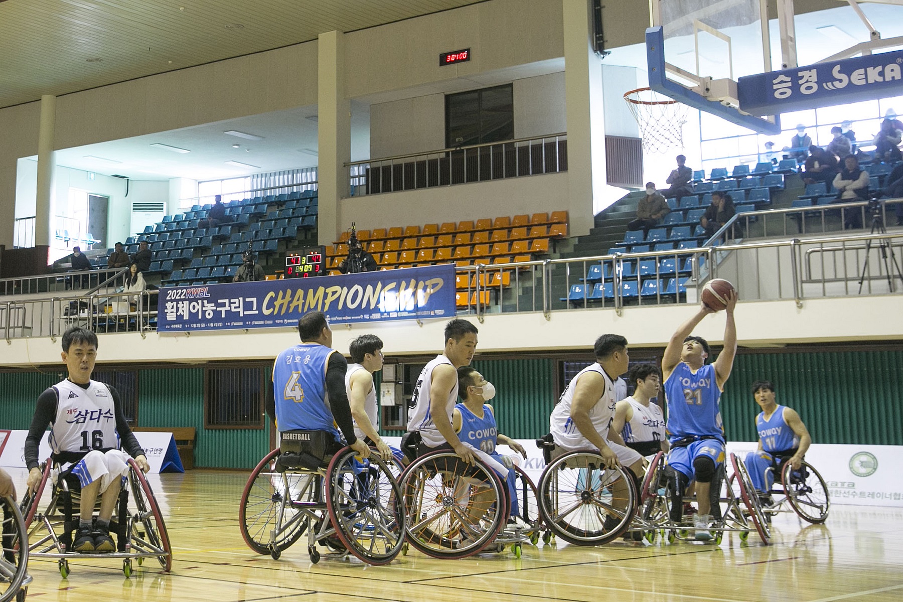 [사진자료 2~3] 지난 4일 제주 구좌체육관에서 열린 코웨이 휠체어농구단과 제주 삼다수의 '2022 KWBL 휠체어농구리그' 플레이오프 3차전 경기 모습