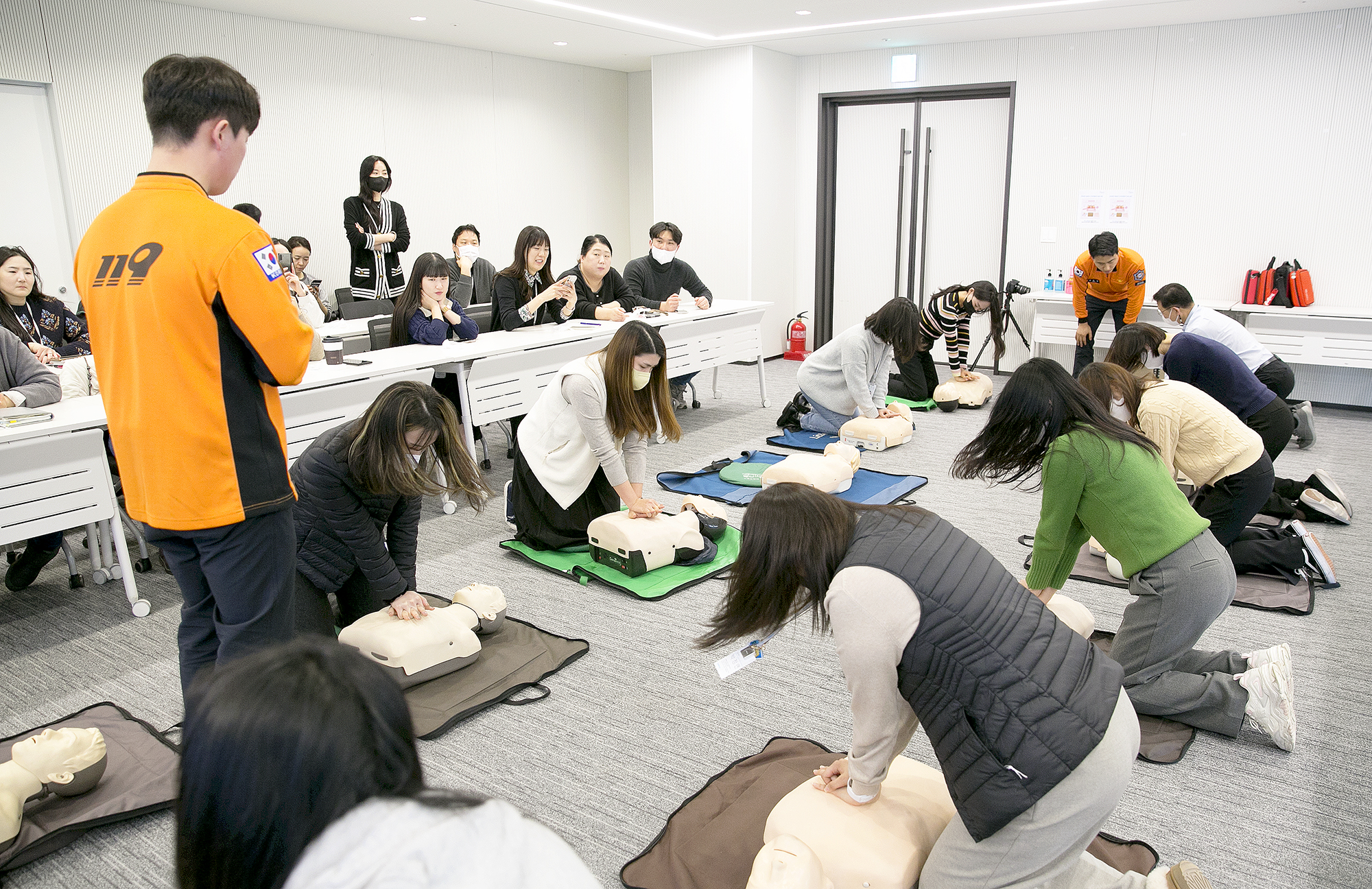 코웨이가 서울 구로구 본사에서 임직원 대상 응급처치 및 심폐소생술 교육을 진행했다. 직원들이 심폐소생술 실습 교육을 받고 있다.