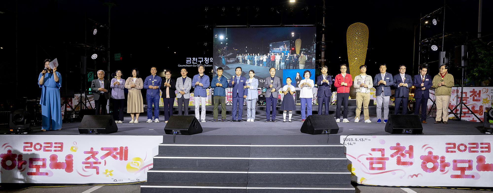 [사진자료3] 코웨이 장성민 합창단원(오른쪽 11번째)과 유성훈 금천구청장(오른쪽 10번째), 최기상 금천구 국회의원(오른쪽 7번째) 및 내빈들이 축제 개막을 알리는 점등식에서 불을 붙이고 있다.