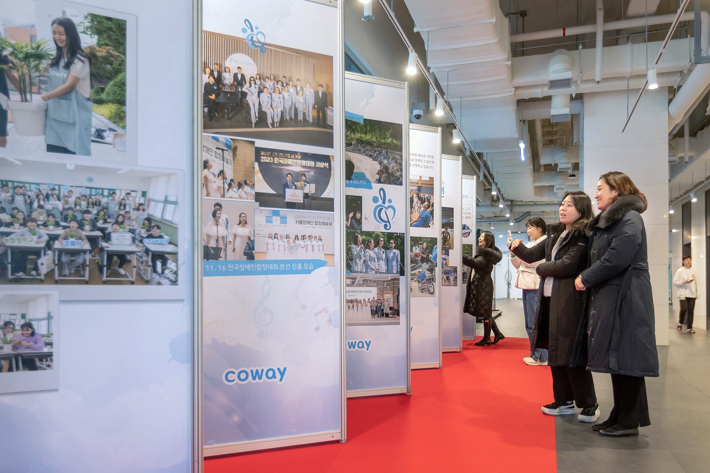 사진전은 올 한해 진행한 코웨이의 사회공헌 활동과 임직원 친환경 봉사활동 모습을 담았다. 장애인 일자리 창출 및 스포츠·문화예술 활성화를 위해 운영하는 ‘블루휠스 휠체어농구단’과 ‘물빛소리 합창단’의 활약상을 전하며, 코웨이 임직원과 시민들이 함께 환경을 보호하는 ‘2023 리버플로깅 캠페인’, 초등학교에 공기정화식물을 기부하고 멸종위기식물을 식재하는 ‘청정학교 교실숲’ 등 올해 진행한 다양한 친환경 캠페인 모습도 함께 전시했다.