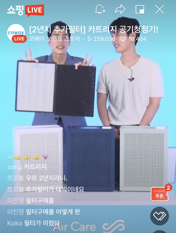 코웨이 관계자는 “카트리지 공기청정기를 비롯해 코웨이 혁신 제품에 대한 소비자의 뜨거운 관심이 오프라인을 넘어 라이브 커머스 방송을 통해 온라인 시장까지 이어지고 있다”며 “앞으로도 다양한 제품 소개와 함께 풍성한 혜택을 제공하는 라이브 방송을 지속해서 선보일 예정이다”고 말했다.