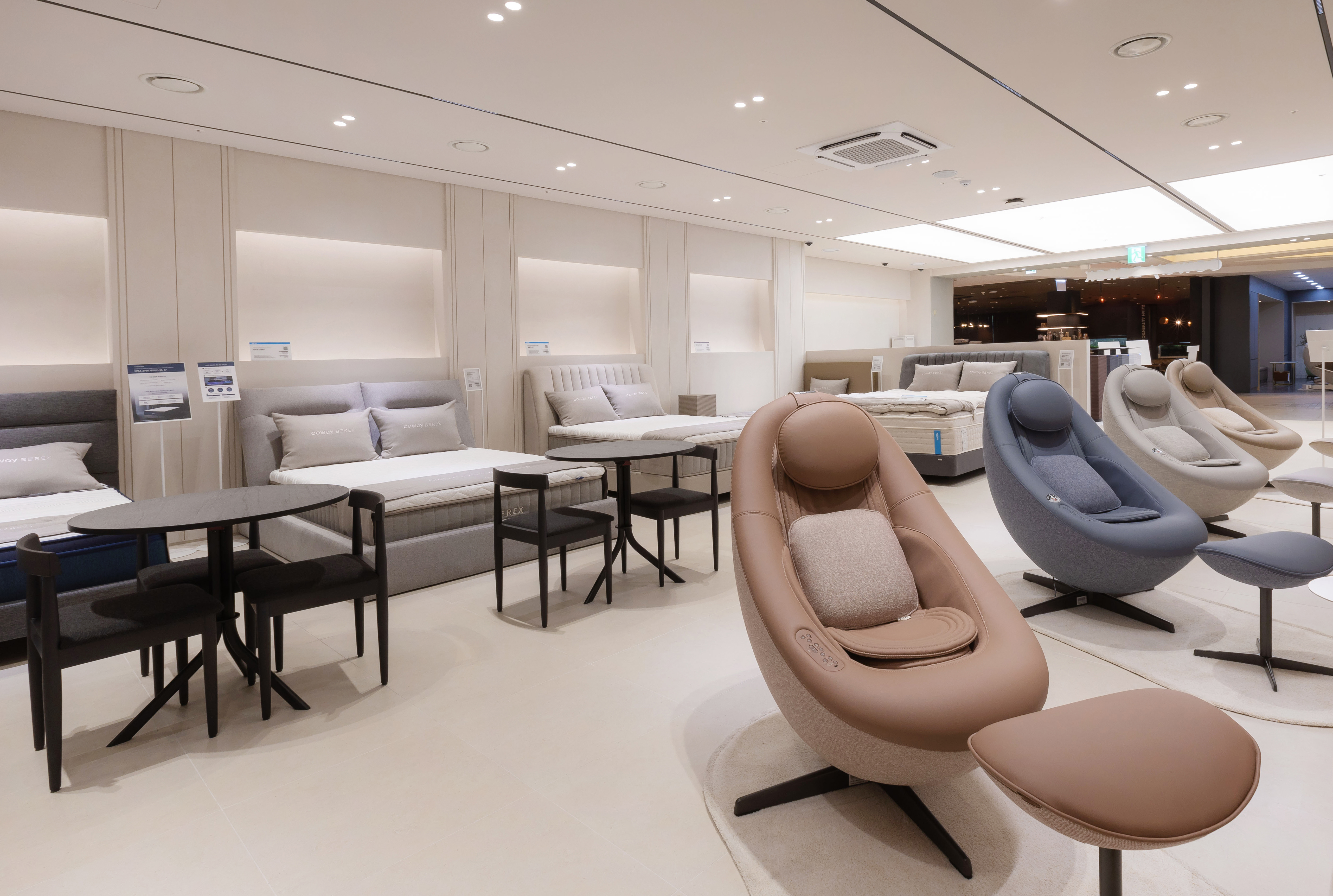 해당 매장은 침실, 거실 등 실제 집처럼 연출된 ‘쇼룸 공간’, 비렉스 리클라이닝 안마베드ㆍ척추베드, 비렉스 페블체어 등 비렉스 혁신 제품을 체험해볼 수 있는 ‘비렉스 체험 공간’, 다양한 코웨이 제품을 전시해놓은 ‘제품 전시 공간’, 제품 구매 및 상담을 진행할 수 있는 ‘상담 공간’으로 구성됐다. 고객들이 제품 체험과 구매를 편리하게 할 수 있도록 매장 내 전문 상담 인력도 배치했다.