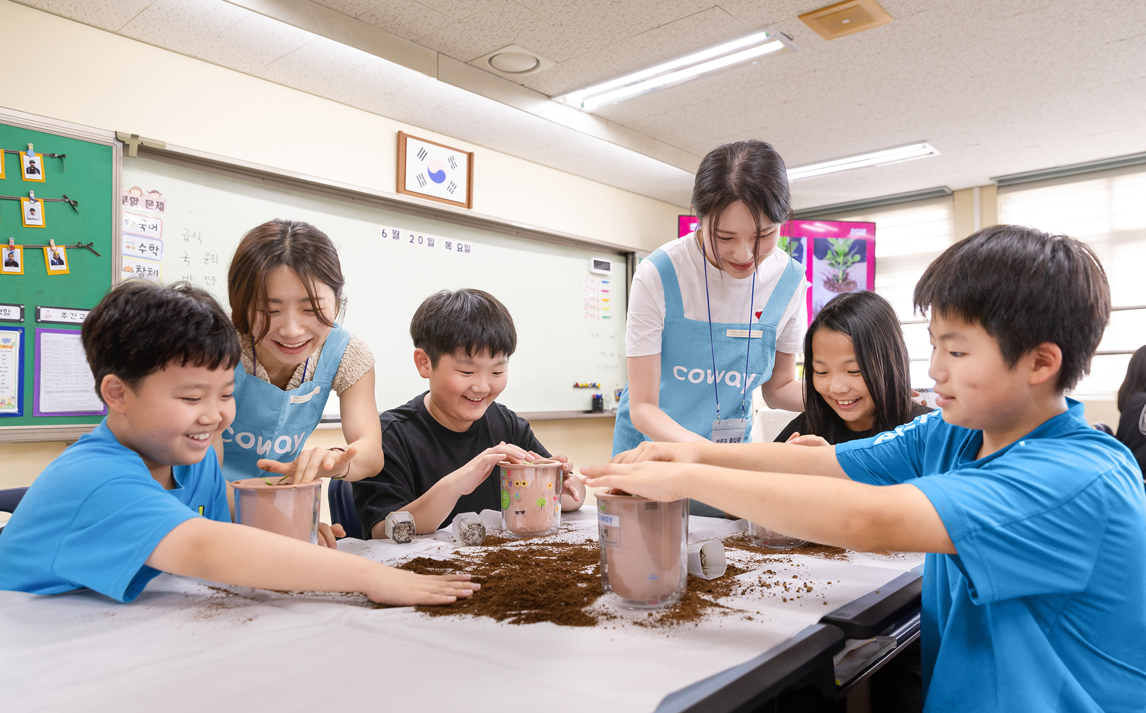 코웨이는 임직원 자원봉사단과 함께 서울 금천구에 위치한 탑동초등학교의 19개 학급에 공기정화식물 총 494그루를 전달하고, 학생들이 직접 참여하는 창작 동시 공모전을 개최했다.