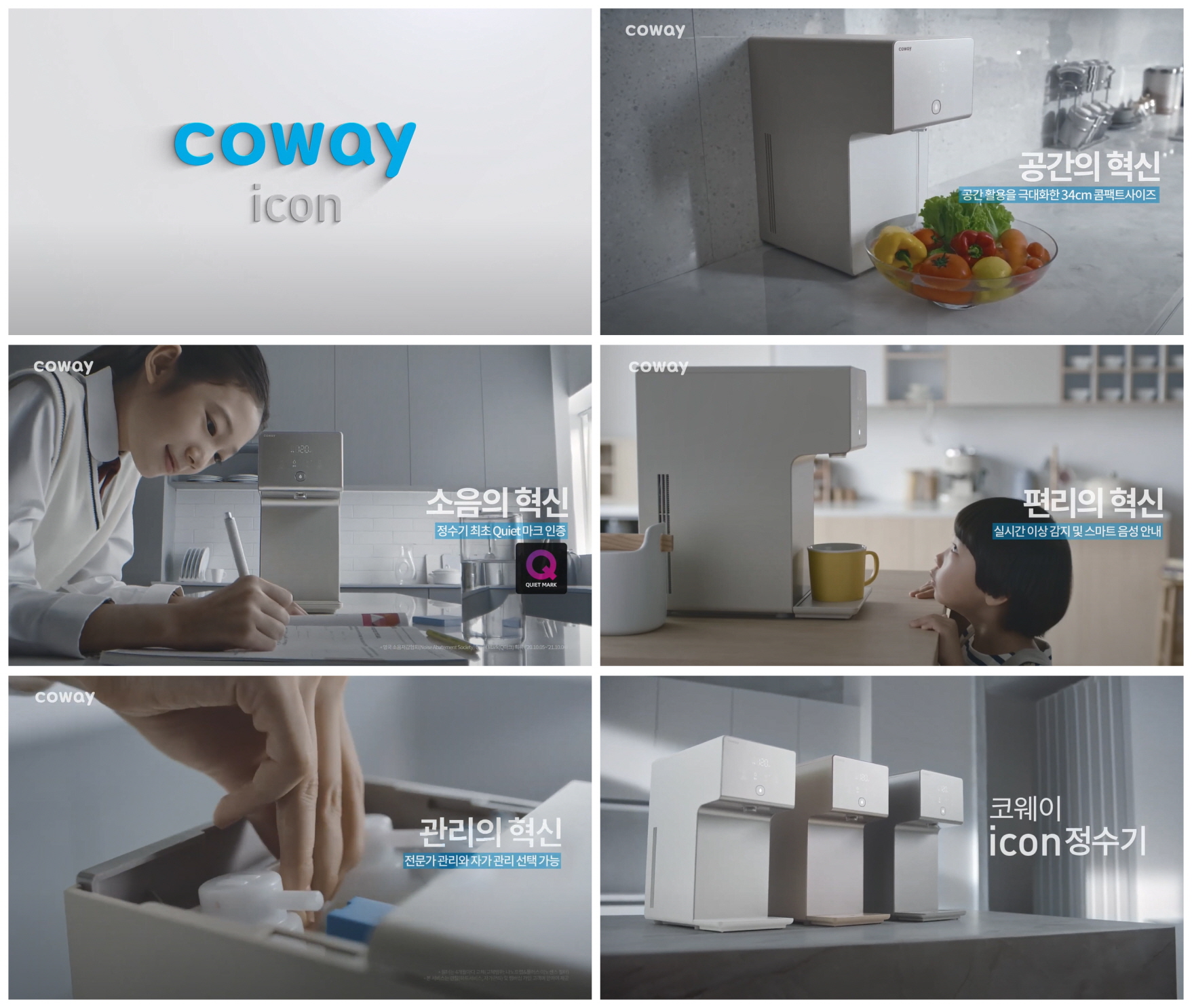 이번 코웨이 아이콘 정수기 광고는 ‘모든 혁신을 다 담고도 공간은 더 여유롭게’를 메인 카피로 하여 업계 1위가 선보인 차별화된 제품 혁신성을 자신감 있는 직관적인 문구와 경쾌한 리듬감의 배경음악으로 생동감 있게 연출했다.