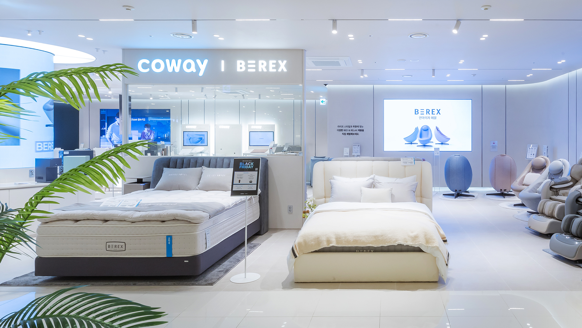 부산 광복 직영점은 신제품 ‘비렉스 스마트 매트리스 S8+’를 비롯해 아이콘 얼음정수기, 비렉스 페블체어 등 베스트셀러를 직접 체험해보고 구매할 수 있다. 백화점 내부에 위치해 쾌적한 환경을 자랑하며 코웨이 브랜드 체험은 물론 다양한 쇼핑과 문화생활까지 연계해 누릴 수 있다.