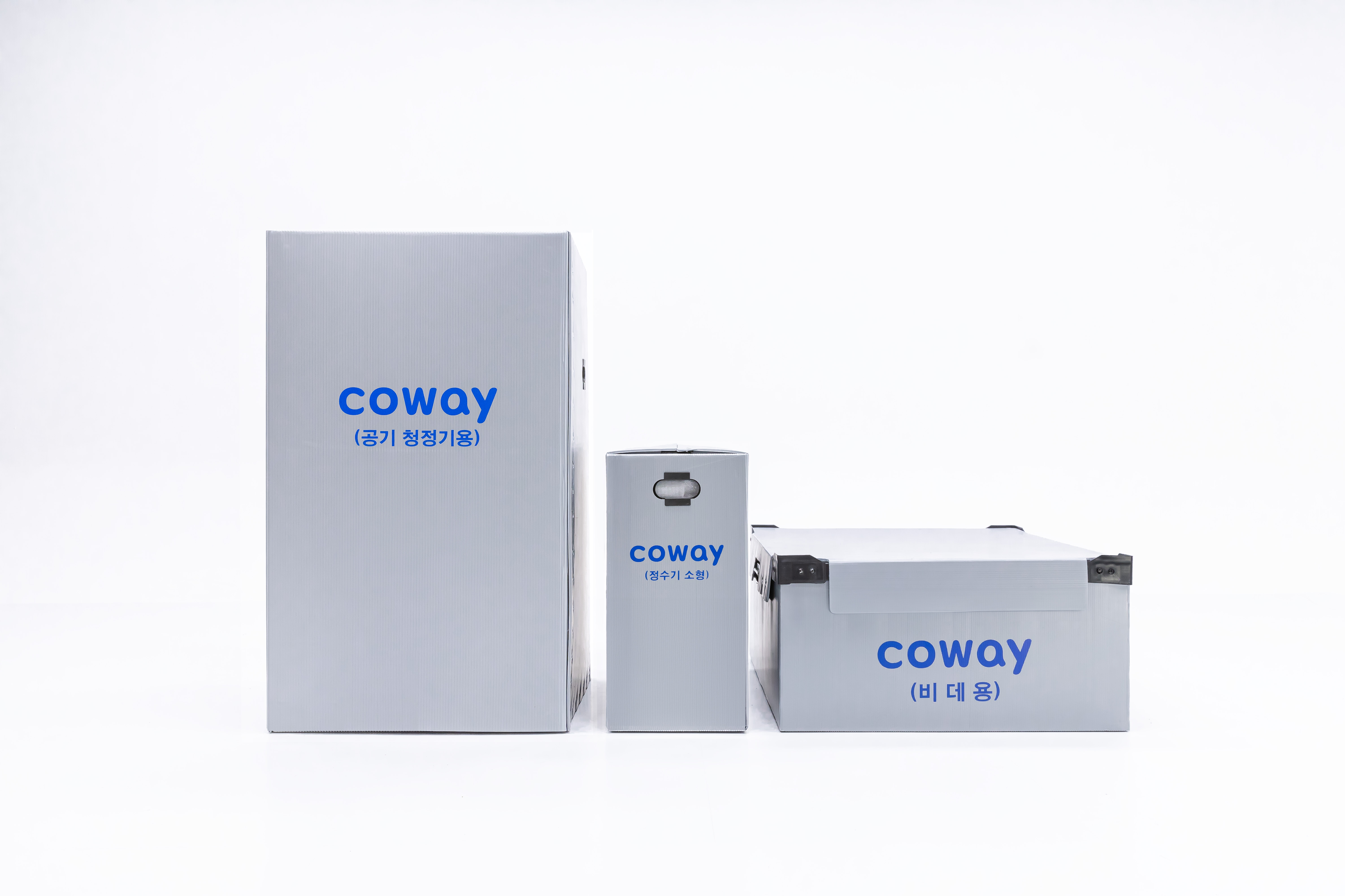 코웨이 반환 제품 회수용 패키지는 재사용성이 높은 소재인 폴리프로필렌(Polypropylene)을 활용해 재사용성을 높이고 완충 성능과 내구성을 강화해 고중량의 제품까지 포장이 가능하도록 설계했다. 또한 포장 박스는 접을 수 있는 조립형 구조로 부피를 최소화해 운송 시 발생하는 탄소 배출량 또한 절감했다.
