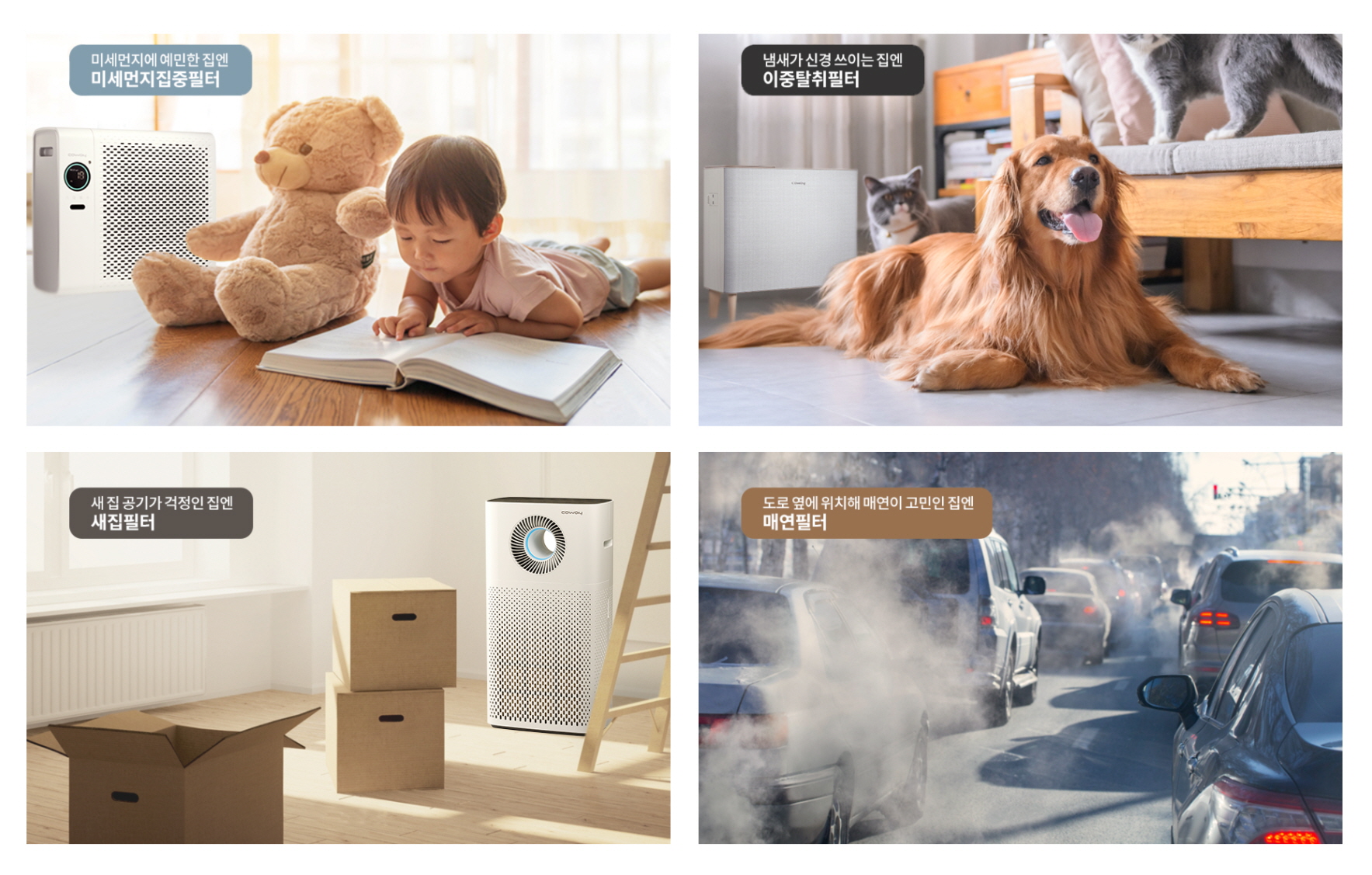 코웨이 공기청정기 에어매칭필터는 △ 이중탈취필터 △ 매연필터 △ 미세먼지집중필터 △ 새집필터로 구성된다. 제품 모델에 따라 적용되는 필터는 상이하다. 실내 냄새가 신경 쓰이는 집은 ‘이중탈취필터’, 도로변에 위치해 매연이 고민인 집은 ‘매연필터’, 생활 먼지가 많은 집은 ‘미세먼지집중필터’, 새집 공기가 걱정인 집은 ‘새집필터’를 선택하면 된다.