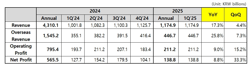 - First-quarter revenue: KRW 1,174.9 billion (+17.3% YoY)
