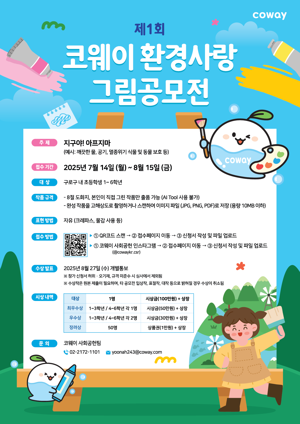 작품은 8절 도화지에 자유 형식으로 표현할 수 있으며, 오는 8월 15일까지 제출 가능하다. 참가자는 공모전 안내 포스터 내 QR코드 혹은 코웨이 사회공헌 인스타그램(@cowaykr.csr) 프로필 링크를 통해 접수 페이지에 접속해 작품을 제출하면 된다.
