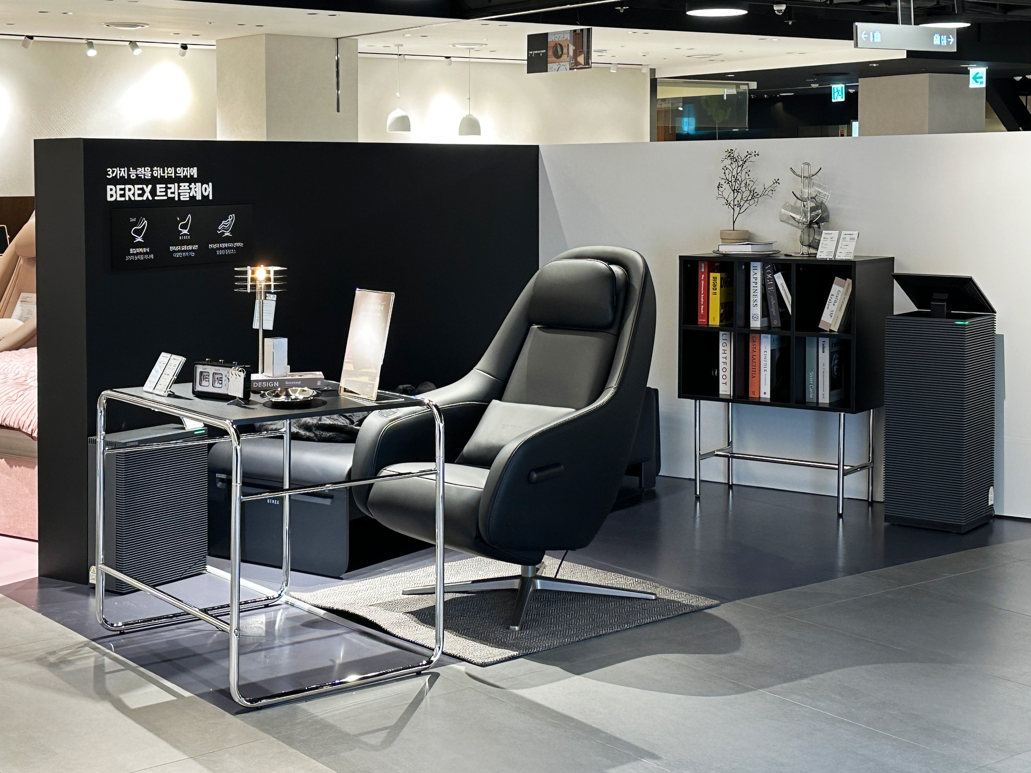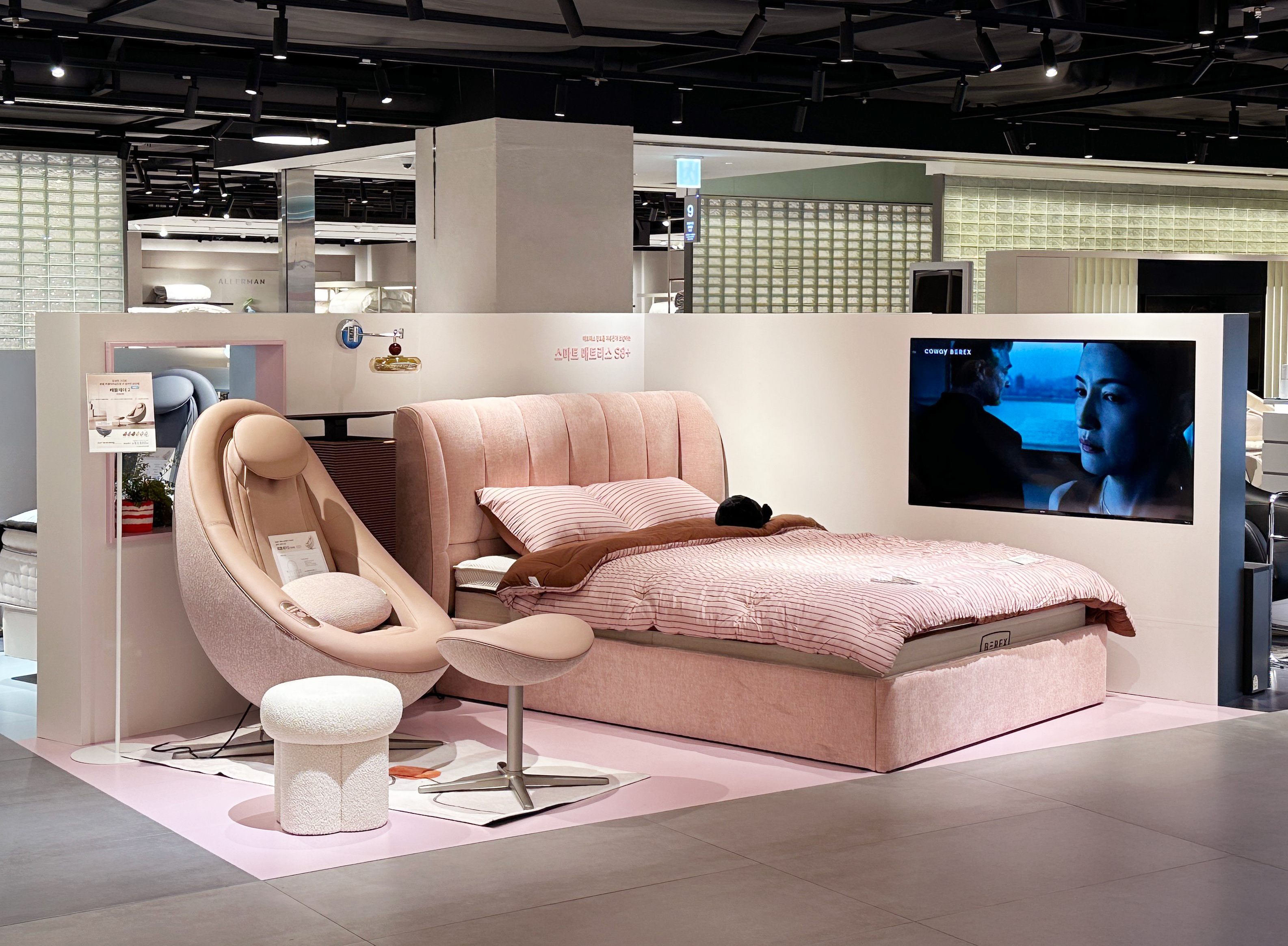 코웨이갤러리 롯데 잠실 팝업스토어에는 슬립·힐링케어 브랜드 비렉스(BEREX) 제품이 실제 주거 공간처럼 배치됐다. 침실과 거실 형태의 체험 존을 통해 제품이 일상 공간과 이루는 조화를 직관적으로 보여준다.