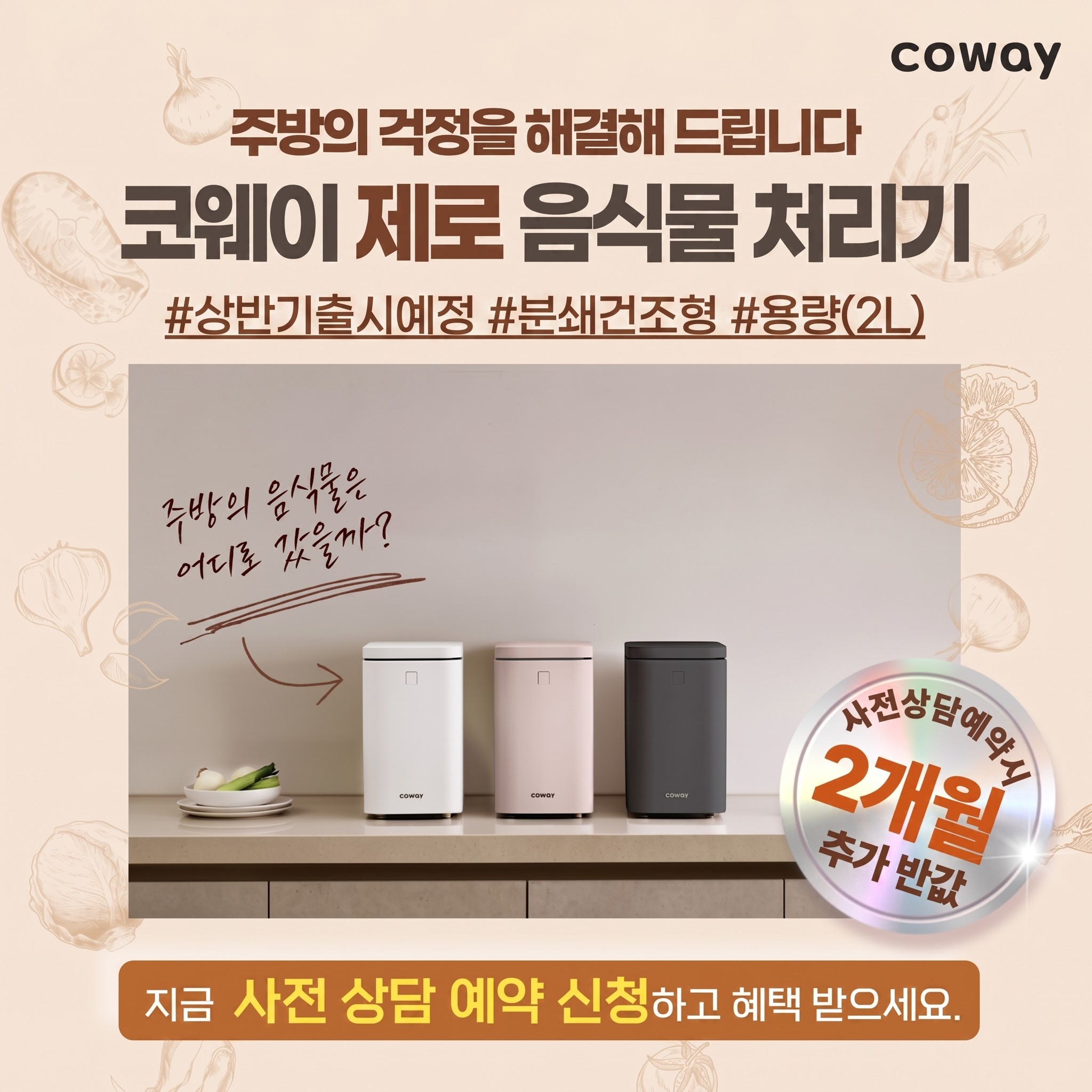 베스트 라이프 솔루션 기업 코웨이(대표 서장원)가 상반기 내 출시 예정인 신제품 ‘제로 음식물 처리기’의 사전 상담 및 예약을 진행한다.